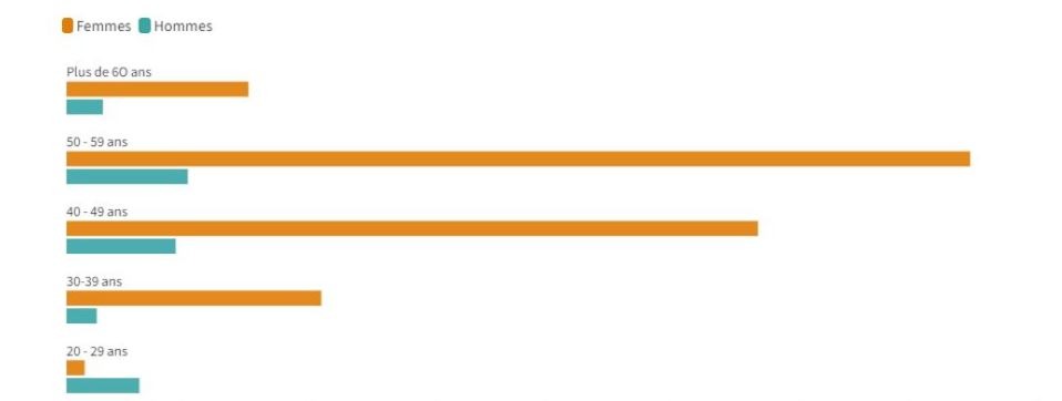 Sans surprise, le métier de documentaliste est un métier exercé essentiellement par des femmes. C’est également une profession qui voit ses professionnels s’approcher de l’âge de la retraite. La plus forte population compose avec un métier vieillissant, avec des pics importants entre 40 et 59 ans (Enquête 2021-2022).